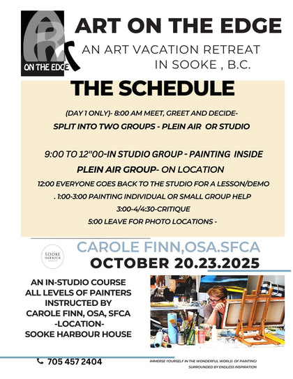 "Art On The Edge" is a retreat designed as a "vacation from the world," offering a dedicated and uninterrupted opportunity to explore your passion for creating through four full days of painting and learning. During this time of discovery, you will not only improve your painting skills but also elevate your artistic voice to a new level. This is a chance to truly invest in yourself! The retreat takes place in a stunning environment, with beautiful scenery right outside your window.